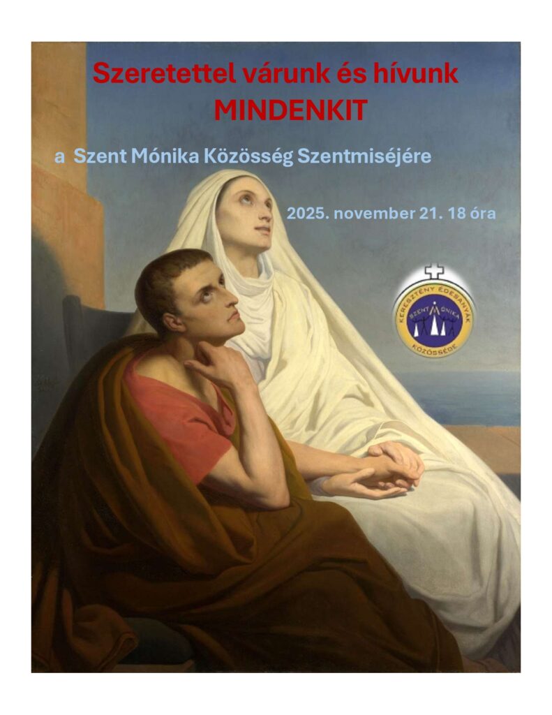 Plébániákon működik az édesanyák Szent Mónika közössége. Szeretettel hívunk és várunk mindenkit a csoport megújuló szentmiséjére, amely november 21-én, pénteken, este 6.00 órakor lesz.